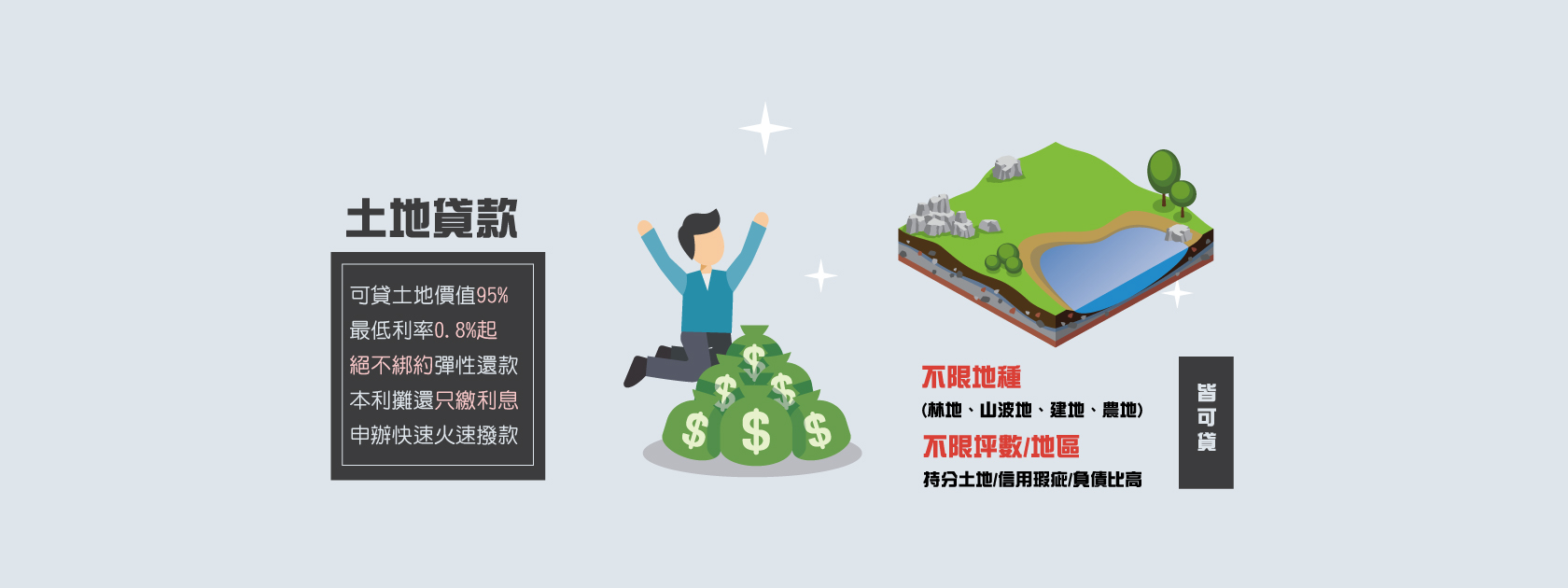 民間土地貸款:不綁約、彈性還款、快速融資週轉管道,最低利率只要0.8%起,申辦時間只要1~2個工作天,最快可當日撥款,不論您是否信用瑕疵、土地持分、貸款遲繳、銀行協商、負債比過高、等任何銀行無法申辦的問題,都可以幫您一次搞定。